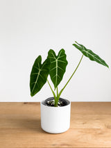 Alocasia ‘Frydek’ stands out for its velvety, arrow-shaped foliage and sharp, high-contrast veining. Deep green leaves are cut through with crisp white lines, giving it a clean, graphic feel that leans more refined than loud. Sleek, structured, and quietly striking.