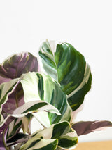 Calathea ‘White Fusion’ is a true standout, known for its striking white and green variegation that feels almost painted on. Each leaf is completely unique, with bold contrast and a soft, marbled finish. Lush yet refined, it brings instant impact to any space.