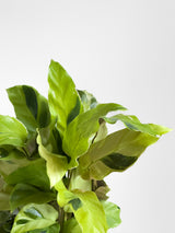 Calathea ‘Yellow Fusion’ is a living brushstroke—splashed with swirling tones of lime green, cream, and forest hues across elongated leaves, each one totally unique. Native to the tropical forests of South America, this variety is known for its high drama and striking variegation. It’s not the easiest roommate, but when it’s happy, it’s an absolute stunner.