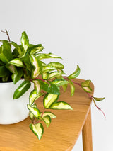 Hoya australis ‘Lisa’ is a striking variegated climber with thick, glossy leaves marbled in shades of cream, soft green. Its trailing growth habit and sculptural foliage make it a beautiful choice for shelves, hanging planters, or training up a support. Elegant yet playful, it brings light and texture to any space.